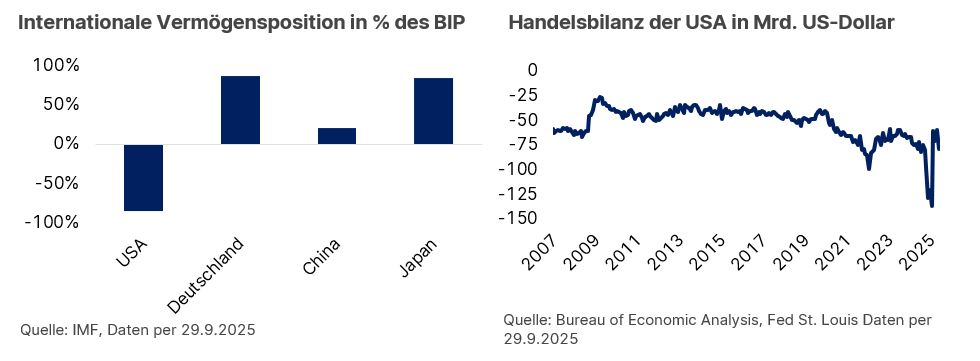 Zudem arbeitet die US-Regierung daran, ihre Abhängigkeit von ausländischem Fremdkapital zu reduzieren, indem sie die heimische Industrie („America First“) und Exportwirtschaft unterstützt und so durch Handelsbilanzüberschüsse wieder Geld ins Land bringt. Wie wir wissen, ist Donald Trumps bevorzugtes Werkzeug dafür der Einsatz von Handelszöllen. Diese sollen die relative Attraktivität US-amerikanischer Güter am internationalen Markt stärken und zusätzlich durch den günstigeren US-Dollar-Wechselkurs vermehrt nachgefragt werden. Bislang ist die US-Wirtschaft über den Dienstleistungs- und Technologiesektor zwar weiter stark gewachsen, die Zugewinne in der Industrieproduktion und im Exportsektor sind bis auf die neuen Zolleinnahmen allerdings weitgehend ausgeblieben, trotz einer 11,5%-igen Abwertung des US-Dollar-Index.