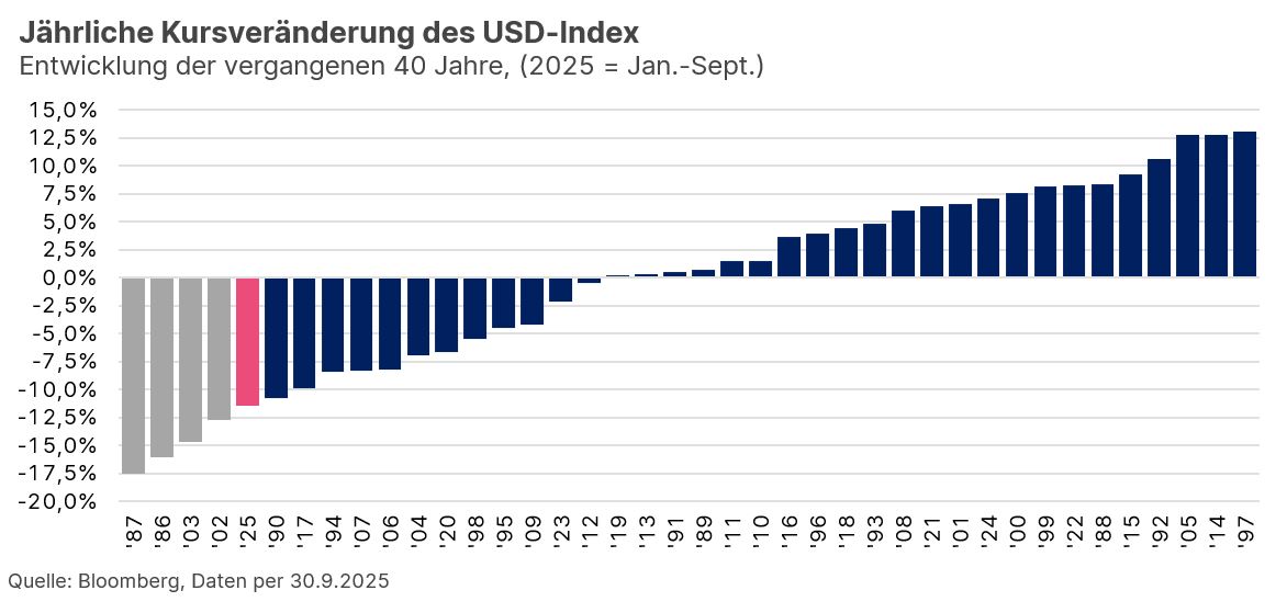 Heute müssen wir feststellen, dass sich diese Unsicherheit, geprägt von der US-amerikanischen Politik, im 3. Quartal nicht gelöst hat. Das hat vor allem damit zu tun, dass die US-Regierung unter Trump durch Eingriffe in politische Institutionen das Vertrauen in die Neutralität dieser infrage stellt. Schließlich ist diese Neutralität eine der Grundsäulen des amerikanischen Wirtschaftssystems, worauf ausländische Investor:innen seit Jahrzehnten bauen.