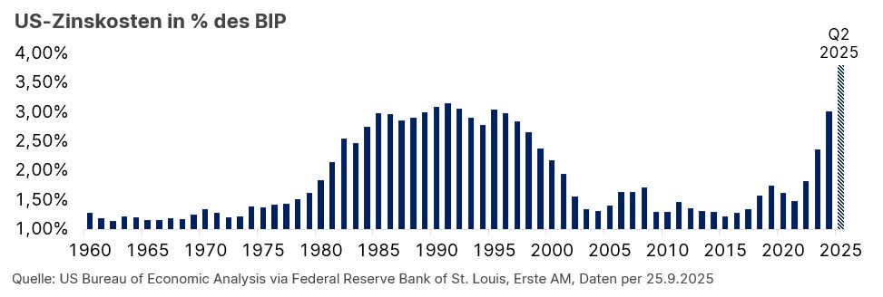 Nach einem schwächelnden Arbeitsmarktbericht ordnete Präsident Trump im August die Entlassung von Erika McEntarfer an, der Chefin des Büros für Arbeitsmarktstatistik, welches unter anderem auch für die Erstellung der Inflationsberichte zuständig ist. Zudem übte die Regierung verstärkt Druck auf Fed-Gouverneurin Lisa Cook aus, die deren Ambition, die Zinsen weiter zu senken, im Weg steht. Ein Grund für diese Vorgehensweise liegt darin, die Zinskosten, die in diesem Jahr ein neues Allzeithoch erreicht haben, künstlich zu drücken. Einerseits soll damit ermöglicht werden, neue Staatsschulden aufnehmen zu können, welche aufgrund von Steuersenkungen benötigt werden. Andererseits will man damit die heimische Industrie („America First“) sowie die Kapitalmärkte unterstützen. Die Umsetzung der „Big Beautiful Bill“, könnte die Situation zudem weiter verschärfen und die Zinskosten in % des BIP von aktuell geschätzten 3,8% (Q2 2025) auf über 5% bis Ende des Jahrzehntes bringen.