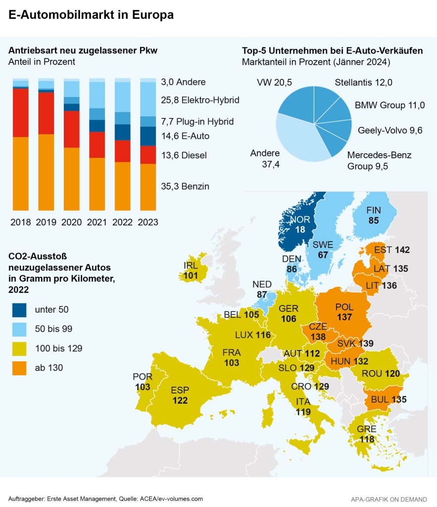 In der EU dürfen ab 2035 nur noch Fahrzeuge auf den Markt gebracht werden, die kein CO2 ausstoßen. 2023 stieg die Zahl neuer E-Autos in der EU um 37% auf 1,54 Millionen. Der Marktanteil kletterte auf 14,6%. Auf Benziner entfiel der größte Anteil von 35,3%, gefolgt von integrierten Hybriden (25,8%), Diesel-Fahrzeugen (13,6%) und aufladbaren Plug-in-Hybriden (7,7%).