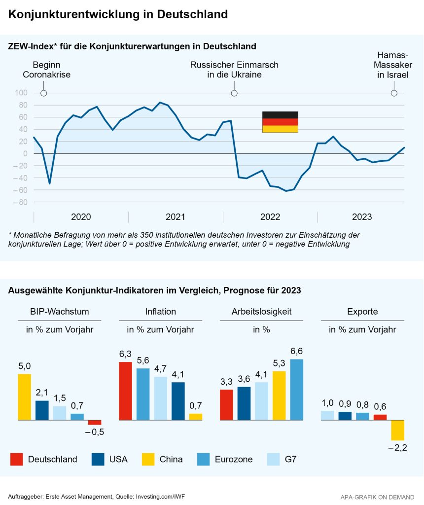 Deutschlands Wirtschaft war im Sommer um 0,1 Prozent geschrumpft. Sollte die Konjunktur wie von Ökonomen erwartet auch im vierten Quartal schwächeln, würde sie damit in eine vorübergehende, sogenannte technische, Rezession rutschen. Der Internationale Währungsfonds (IWF) prognostiziert in seinem aktuellen Bericht zur Weltwirtschaft für Deutschland heuer ein BIP-Minus von 0,5 Prozent. Damit würde Deutschland als einzige große Volkswirtschaft schrumpfen.