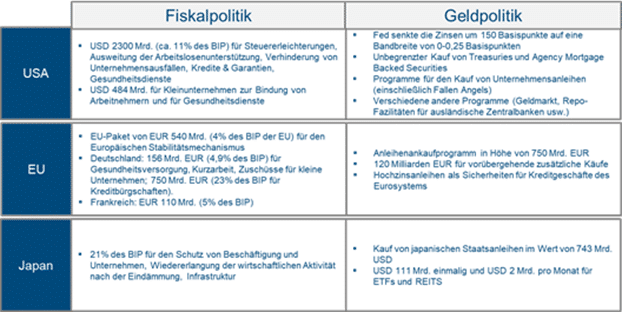 Wie wir schon oft berichtet haben, sind seit dem Ausbruch der Pandemie sehr weitreichende fiskal- und geldpolitische Maßnahmen gesetzt worden. Im Umfang und auch der Geschwindigkeit ihrer Ankündigung sind sie in der Wirtschaftsgeschichte fast beispielslos. Einen Ausschnitt der wichtigsten Maßnahmen in den USA, Europa und Japan gibt die folgende Tabelle:
