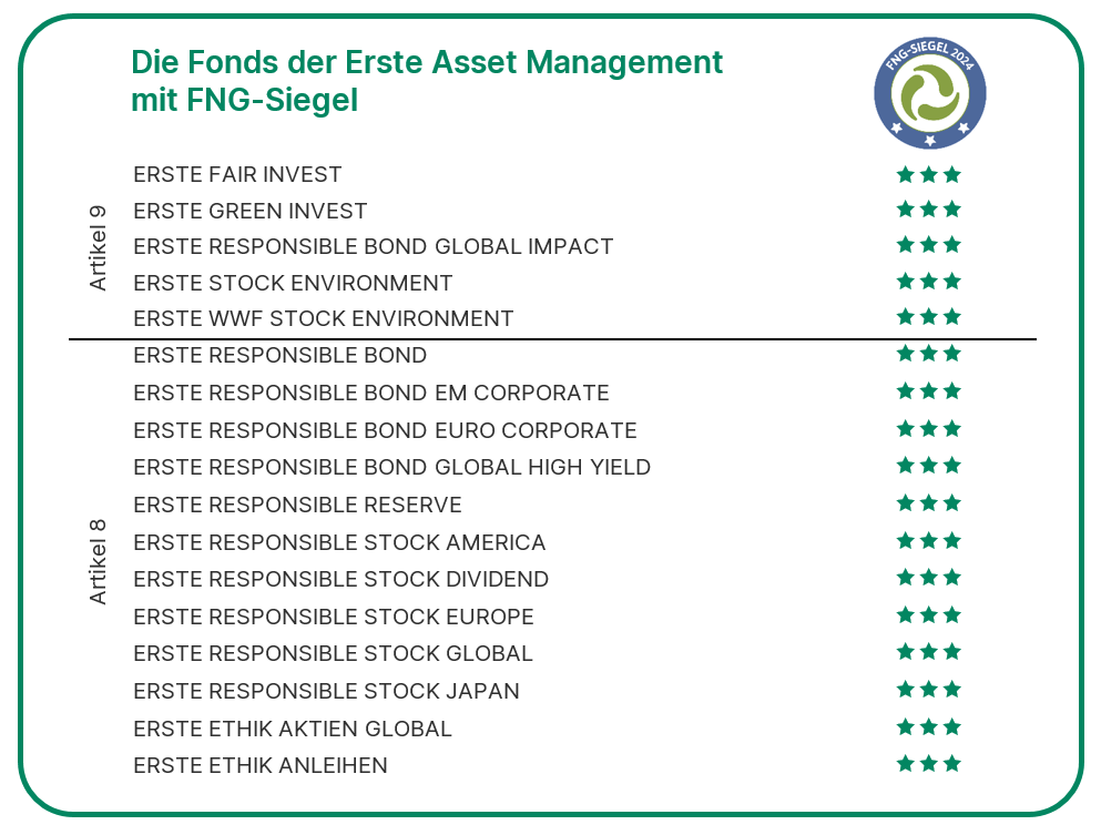 Strenge Kriterien, ein klarer Investmentprozess und langjährige Expertise zahlen sich aus – das zeigt unsere Bilanz bei der diesjährigen Vergabe des FNG-Siegels durch das Forum Nachhaltige Geldanlagen. Alle 17 Fonds die von der Erste Asset Management eingereicht wurden, erhalten das Qualitätssiegel für nachhaltige Investmentfonds mit der Bestnote von drei Sternen.