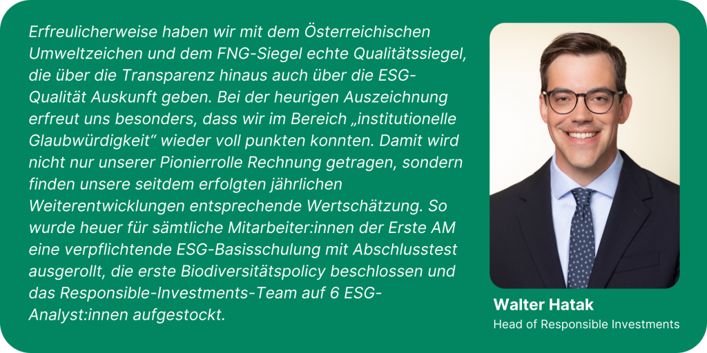 Die zunehmende Fülle an Produkten und Fonds im Nachhaltigkeitsbereich macht jedoch klare Standards und Richtlinien umso wichtiger. Damit gewinnen auch unabhängige Nachhaltigkeits-Siegel zunehmend an Bedeutung. Sie geben Anleger:innen mit einheitlichen Standards und klar definierten Prüfkriterien Orientierung in der Welt des nachhaltigen Investierens. „Es gibt ein sehr starkes Verlangen nach Qualitätssiegel am nachhaltigen Fondsmarkt. Das haben die Reaktionen auf die Offenlegungsverordnung der Europäischen Kommission gezeigt. Leider kann dieses Verlangen mit der Einstufung eines Fonds als Artikel 8 oder 9 allerdings nicht gestillt werden. Diese Einstufungen definieren lediglich, wie transparent die dahinterliegenden Prozesse offengelegt werden müssen“, kommentiert Walter Hatak.
