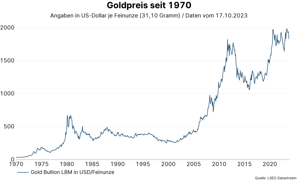 Der Blick auf die Entwicklung des Goldpreises seither zeigt, dass der Ruf als langfristiger Wertspeicher nicht von ungefähr kommt. Ein Investment in das gelbe Edelmetall brachte seit 1970 eine durchschnittliche jährliche Rendite von 7,7%.