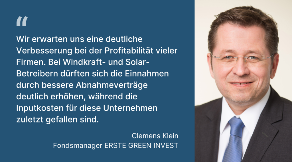 Fallende Zinsen wären für vielen Unternehmen aus dem Umweltbereich natürlich ein willkommener Rückenwind. Was aber noch wichtiger ist: Wir erwarten uns eine deutliche Verbesserung bei der Profitabilität vieler Firmen. Bei Windkraft- und Solar-Betreibern dürften sich die Einnahmen durch bessere Abnahmeverträge deutlich erhöhen, während die Inputkosten für diese Unternehmen zuletzt gefallen sind. Der Zeitpunkt für einen Stimmungsaufschwung ist natürlich schwer einzuschätzen, aber mittel- bis langfristig sind wir sehr optimistisch gestimmt.
