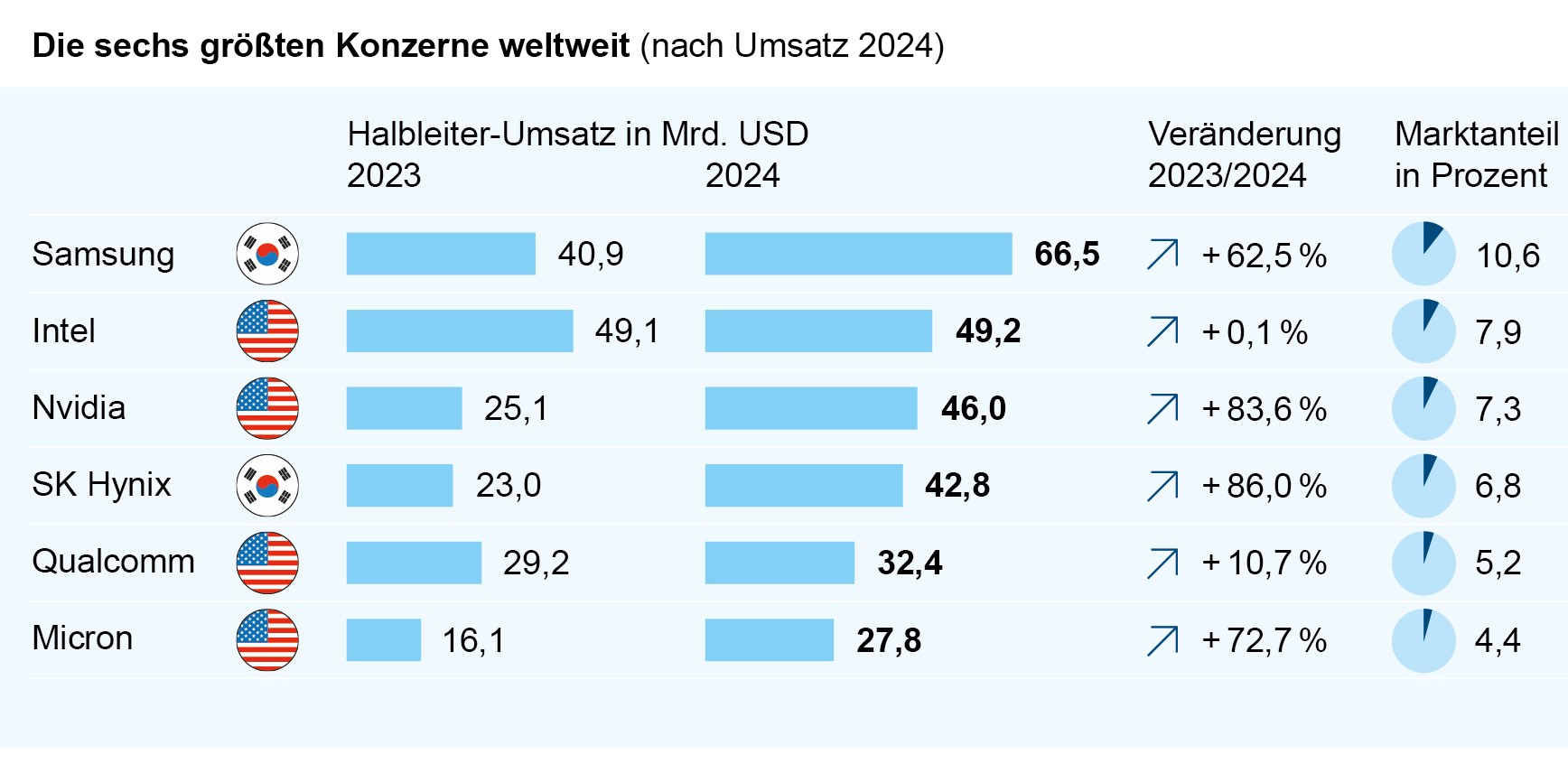 Gute Zahlen kamen zuletzt auch von Samsung. Der Chipkonzern aus Südkorea hat für das erste Quartal einen Gewinn von umgerechnet rund 4,1 Mrd. Euro gemeldet, das entspricht einem Anstieg von etwas mehr als einem Prozent im Vergleich zum Vorjahr. Der Umsatz stieg im Zeitraum von Jänner bis März sogar um 10 Prozent. 2024 hat der Konzern, der auch andere Elektronikprodukte wie Fernseher oder Smartphones herstellt, laut dem Marktforschungsunternehmen Gartner allein mit Halbleiterprodukten einen Umsatz von rund 66,5 Mrd. Dollar eingefahren. Im Gartner-Ranking hat Samsung damit den Spitzenplatz zurückerobert und den Mitbewerber Intel auf den zweiten Platz verdrängt.