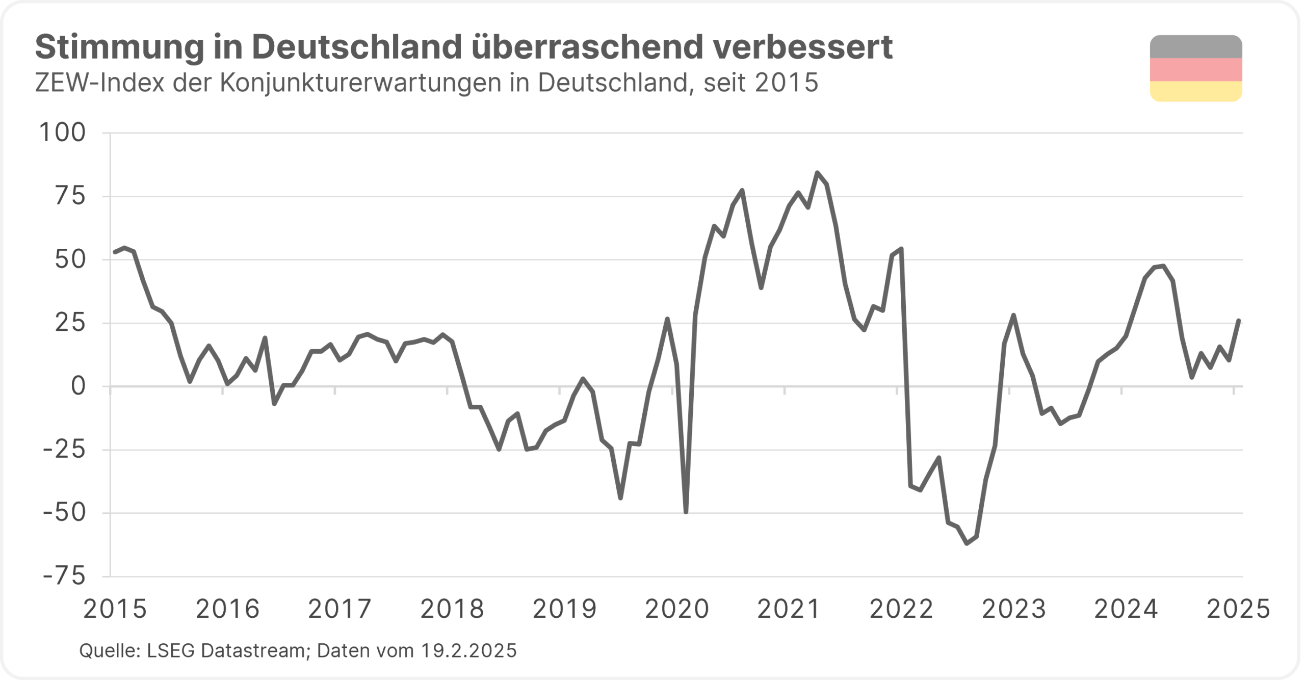 Auch die Stimmungsindikatoren aus der Wirtschaft geben ein gutes Gefühl dafür, wie hoch die Unsicherheit am Markt ist. In den USA ist die Stimmung unter den Unternehmen seit November deutlich angestiegen. Auch im Fertigungssektor hat sich die Stimmung sowohl in Europa als auch global verbessert. Selbst in Deutschland haben sich die Aussichten überraschenderweise verbessert. Laut dem ZEW (Zentrum für Europäische Wirtschaftsvergleiche) sind die Konjunkturerwartungen der Finanzanalysten für Deutschland im Februar erheblich angestiegen.