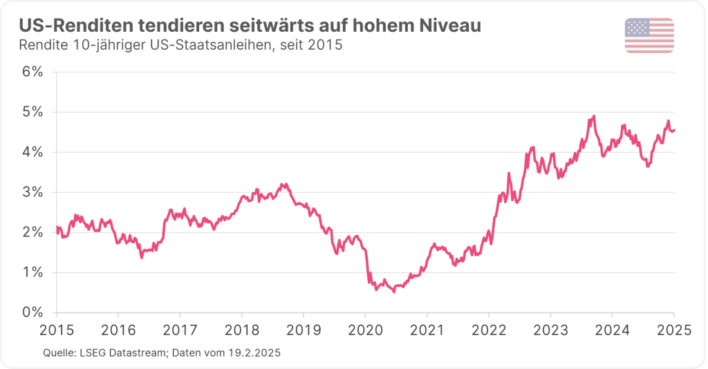Seit Ende 2024 sind die Renditen auf US-Staatsanleihen wieder deutlich angestiegen. Am Markt wurden höhere Staatsschulden und ein mögliches Zurückkommen der Inflation eingepreist. Zum Szenario „No Landing“ würde höhere Renditen passen.