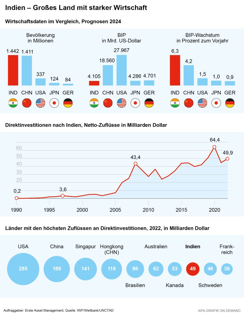 Indiens Wirtschaft boomt und könnte dank der Rolle des Landes als potenzielle Alternative zu China in Zukunft noch stärker wachsen. Innerhalb von drei Jahren will Indien zur drittgrößten Volkswirtschaft der Welt aufsteigen – nach den USA und China. Das Bruttoinlandsprodukt (BIP) werde in diesem Zeitraum voraussichtlich 5 Billionen Dollar erreichen, heißt es in einem Ende Jänner veröffentlichten Bericht der indischen Regierung.