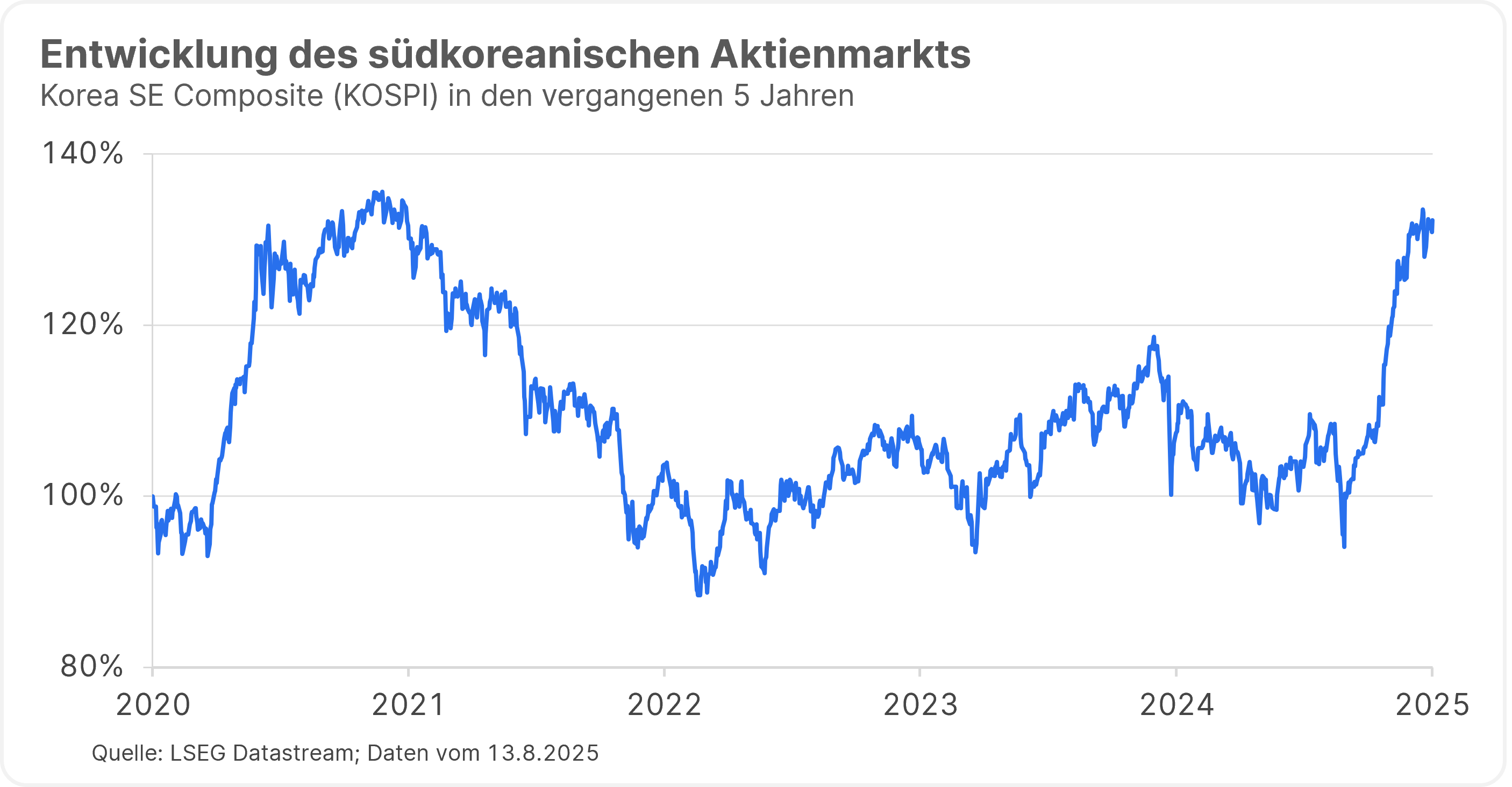 Die jüngsten Wahlen haben die politische Unsicherheit in Südkorea reduziert, welche die Märkte zuvor belastet hatte. Präsident Lees ambitioniertes Fiskalprogramm in Höhe von 45,6 Billionen KRW zielt darauf ab, die südkoreanische Wirtschaft im zweiten Halbjahr 2025 durch groß angelegte Maßnahmen anzukurbeln. Dazu gehören universelle Bargeldzahlungen an Bürger:innen, Unterstützung für kleine und mittlere Unternehmen (KMU), Förderung des KI-Sektors sowie Investitionen in Infrastruktur. Diese expansive Fiskalpolitik soll den privaten Konsum und Investitionen stimulieren und gleichzeitig den Handlungsdruck auf die Bank of Korea (BoK) reduzieren, unmittelbare geldpolitische Maßnahmen zu ergreifen.