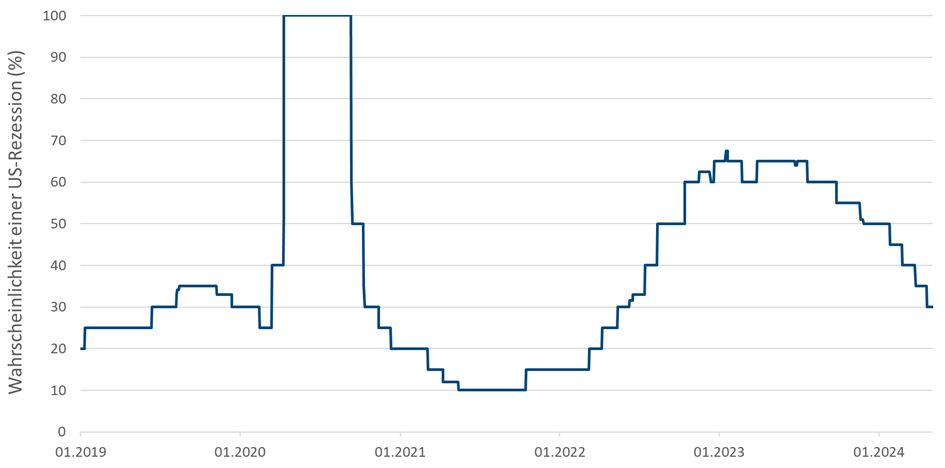 Abbildung 1: Ein Jahr vorausschauende Prognose der Wahrscheinlichkeit einer US-Rezession (Stand: 30. April 2024). Berechnet von Bloomberg anhand des Medians der von Finanzinstituten und Universitäten abgegebenen Schätzungen. Der Wert gibt die aktuelle Prognose für die Wahrscheinlichkeit einer US-Rezession in einem Jahr wieder. Datenquelle: Bloomberg. Grafik: Eigene Darstellung.