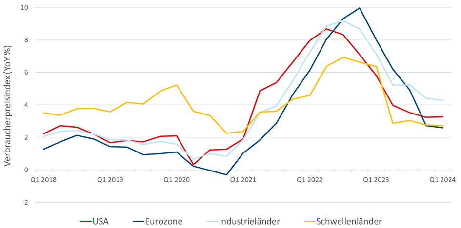 Abbildung 2: Prozentuale Veränderung des Verbraucherpreisindex gegenüber dem Vorjahr (Stand: 30. April 2024). Die Daten sind nicht saisonbereinigt. Datenquelle: Bloomberg. Grafik: Eigene Darstellung.