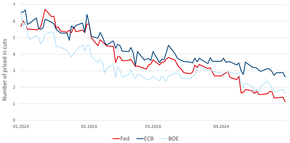Abbildung 3: Anzahl der eingepreisten Leitzinssenkungen der jeweiligen Zentralbanken bis Dezember 2024 (Stand: 30. April 2024). Impliziert auf Basis von Fed Fund Futures im Falle der Fed und Overnight Index Swaps im Falle der EZB und BOE. Eine Senkung entspricht 25 Basispunkten. Datenquelle: Bloomberg. Grafik: Eigene Darstellung.