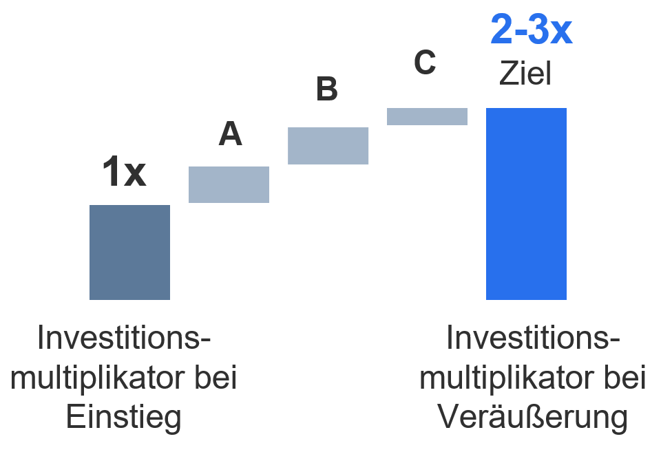 Beim Einstieg tätigen die Manager:innen eine Investition, um das Unternehmen zu kaufen. Nach etwa 4-6 Jahren, wenn das Unternehmen verkauft wird, wird angestrebt, dass der Wert der anfänglichen Investition aufgrund der erzielten Wertschöpfung 2- bis 3-mal höher ist.