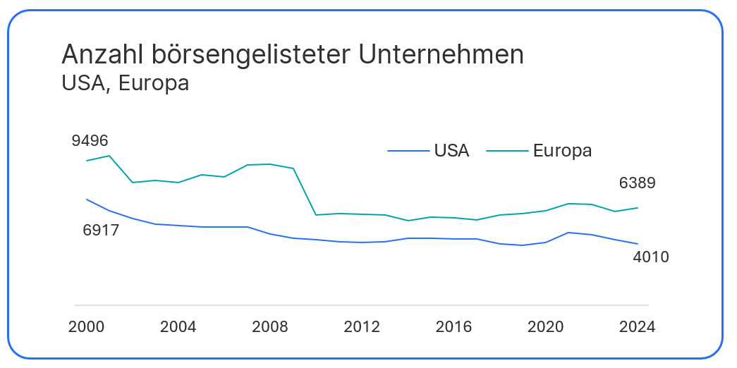 Auch die Anzahl neuer Börsengänge geht zurück, weil Unternehmen länger privat bleiben. In Privatmärkten stehen Unternehmen weniger unter Druck, kurzfristige Erfolge zu erzielen. Stattdessen können sie sich auf nachhaltiges Wachstum konzentrieren, weil ihre Eigentümer eine langfristige Haltedauer anstreben.