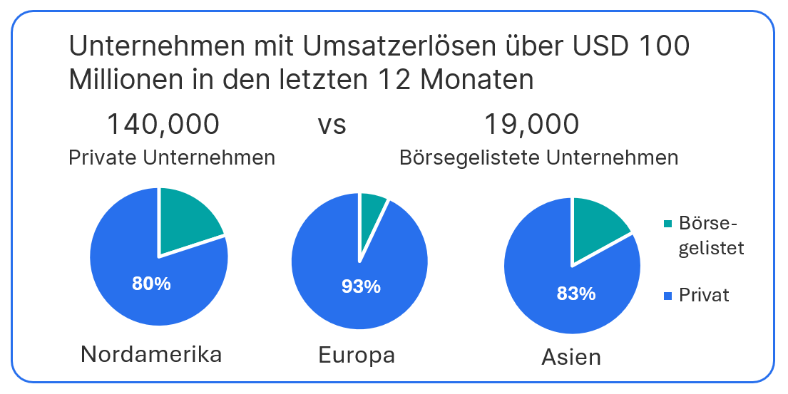 Wenig überraschend ist, dass die Anzahl an privaten Unternehmen, besonders unter Berücksichtigung aller mittelständischen und Familienunternehmen, jene der börsengelisteten Unternehmen übersteigt. In der untenstehenden Abbildung werden deshalb nur Unternehmen berücksichtigt, die Umsatzerlöse über 100 Millionen US-Dollar erzielen. In Nordamerika und Asien befinden sich über 80% dieser Unternehmen in privater Hand während in Europa – wohl einer mangelhaften Kapitalmarktkultur geschuldet – sogar 95% der Unternehmen mit Umsatzerlösen über 100 Millionen US-Dollar nicht börsegelistet sind.