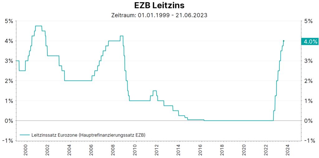 Grafik: EZB Leitzinssatz ab 1999; Quelle: Refinitiv Datastream, Stand per 21.06.2023; Hinweis: Darstellung eines Index, kein direktes Investment möglich. Die Entwicklung der Vergangenheit lässt keine verlässlichen Rückschlüsse auf zukünftige Entwicklungen zu.