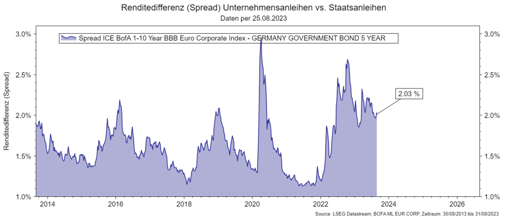 Wir haben im oberen Chart gesehen, dass nominelle Renditen im Zeitverlauf schwanken. Im zweiten Schritt interessiert uns der Risikoaufschlag (Spread), denn dieser gibt an, welchen Mehrertrag wir von einem risikoreicheren Investment erwarten. Wir haben aus den oben gestellten Bonitäts-Segmenten jenes mit dem „BBB“ als Beispiel ausgewählt.