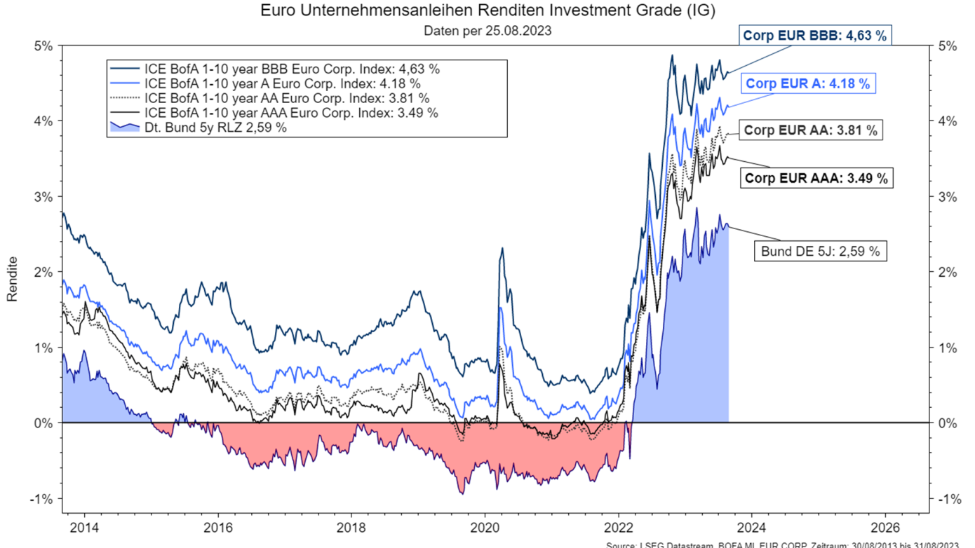 - Euro Unternehmensanleihen (BOFA Index) mit „AAA“ bieten aktuell ca. 1 % mehr Rendite als die deutsche Bundesanleihe.