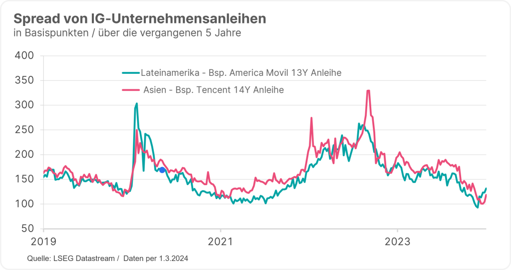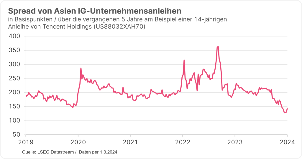 In Zahlen ausgedrückt: Bei asiatischen Investement-Grade-Anleihen, die zumindest eine Zinssensitivität von rund 4,6% haben, liegt die Spreadausweitung bei der ein Investment auf eine US-Staatsanleihe mit der gleichen Zinssensitivität über 12 Monate die gleiche Performance bringen würde, bei etwa 20 Basispunkten.