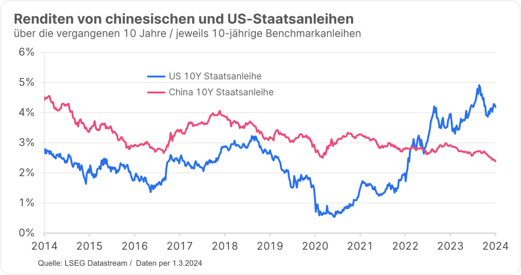 Parallel dazu befindet sich China derzeit in gewisser Weise in einer Konsumflaute. Diese Flaute wirkt deflationär, was die Notenbank unter anderem mit niedrigen Zinsen bekämpft.