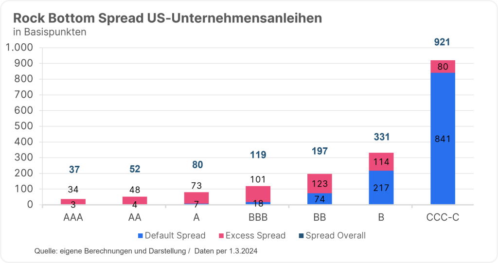 Um diese Frage zu beantworten, werfen wir einen Blick auf den sogenannten „rock-bottom-spread“. Vereinfacht gesagt, ist das der Teil des Risikoaufschlags, welchen man basierend auf der historischen Häufigkeit und dem Ausmaß der Zahlungsausfälle in einer bestimmten Ratingkategorie verlangen sollte, um für etwaige Ausfälle in einem breit diversifizierten Portfolio kompensiert zu werden.