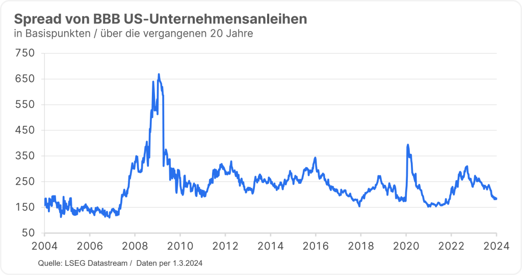 Es muss aber noch andere Gründe geben, warum die Risikoaufschläge generell aus historischer Sicht so niedrig sind. In den USA sehen wir sehr wohl massiv angestiegene Netto-Neuemissionsvolumina bei Unternehmensanleihen und trotzdem sind die Risikoaufschläge (abgebildet US „BBB“ Anleihen) nur knapp entfernt von den Tiefständen der vergangenen 20 Jahren.
