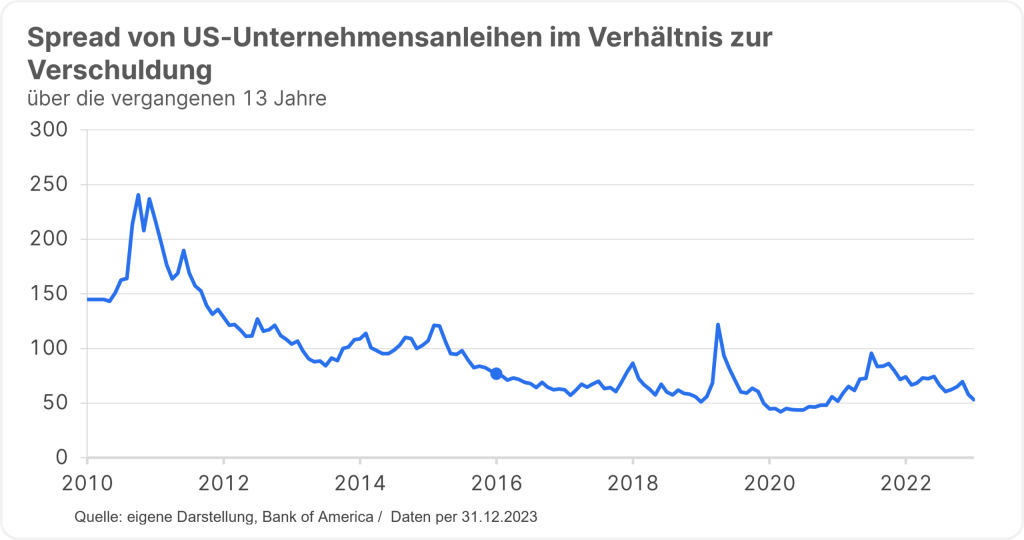 Bei Emittenten mit einem Rating von „AAA“ bis „A“ könnte man argumentieren, dass diese auch theoretisch mit negativem Spread zu US-Staatsanleihen handeln könnten (strategisch wichtige Namen wie Microsoft zum Beispiel), sollte das (Über)Angebot an US-Staatsanleihen wegen einem Haushaltsdefizit zu Renditeanstiegen und zu einem Ungleichgewicht von Angebot und Nachfrage führen.