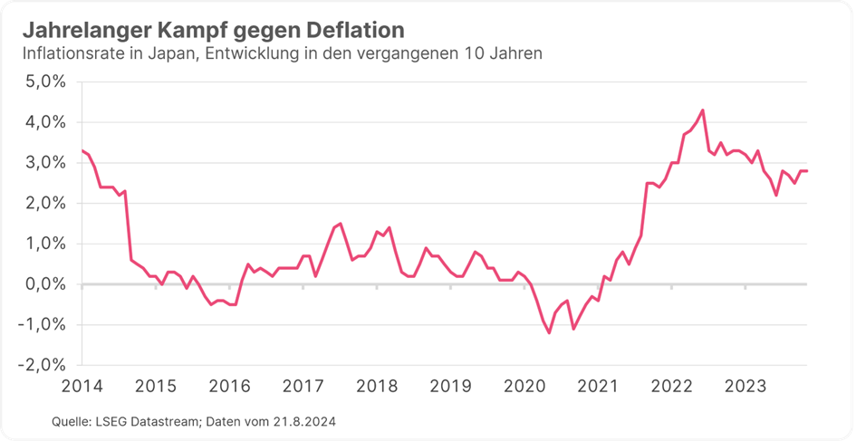 Bisher war Japan geldpolitisch eine Ausnahme unter den großen Volkswirtschaften. Während die Notenbanken anderer Länder ihre Leitzinsen im Kampf gegen die Inflation der vergangenen Jahre sukzessive hochgefahren haben, lagen die Zinsen in Japan praktisch bei null. Damit sollte die Kreditvergabe für Konsum und Investitionen angekurbelt und die Deflation bekämpft werden, die Japan jahrelang belastet hatte. Denn nicht nur Inflation, auch ein Rückgang der Preise kann zum Problem werden, da er zu Konsum- und Investitionszurückhaltung führt und eine wirtschaftliche Abwärtsspirale nach sich ziehen kann.