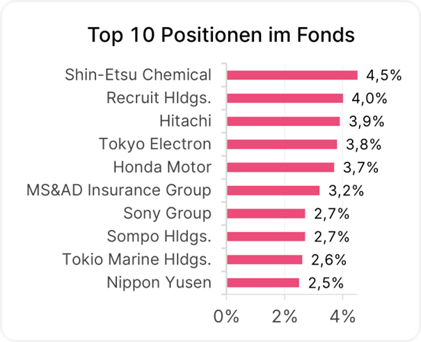 Investiert wird in Aktien ausgewählter Unternehmen mit Sitz oder Börsennotiz in Japan. Der Fokus liegt auf Unternehmen mit mittlerer bis hoher Marktkapitalisierung, attraktiver Dividendenrendite und überdurchschnittlicher Qualität. Zudem werden Nachhaltigkeitskritierien im Investmentprozess berücksichtigt.