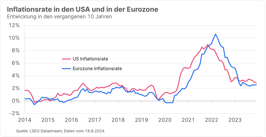 Die heftigen Kursrückgänge an den Aktienmärkten vor rund zwei Wochen sind zwar zu großen Teilen wieder aufgeholt, sie haben jedoch eines gezeigt: Der Pfad für die Erreichung der sogenannten „weichen Landung“ der Wirtschaft ist schmal. An den Finanzmärkten hofft man nach wie vor auf dieses Szenario: Darin würde sich das Wirtschaftswachstum in den USA auf unter das Trendniveau abschwächen und die Eurozone würde wieder zu nachhaltigem Wachstum zurückkehren. Gleichzeitig würde die Inflation weiterhin langsam zurückgehen.