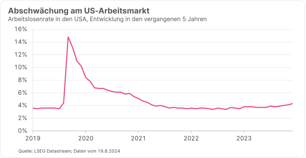 Zusätzlich zu den Carry Trades in Japan, dominierten auch die aufkeimenden Rezessionssorgen das Marktgeschehen zuletzt. In den USA haben vor allem aufgrund der Abschwächung am Arbeitsmarkt die Wachstumsrisiken zugenommen. Zwischen Jänner 2023 und Juli 2024 ist die Arbeitslosenrate in den Vereinigten Staaten von 3,4 auf 4,3% angestiegen.