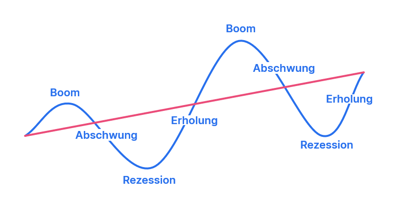 Die bisher besprochenen Supertrends bestimmten den langfristigen Wachstumspfad der globalen Wirtschaft. In der folgenden Grafik haben wir das durch die pinke Linie symbolisiert. Rund um diesen Pfad gibt es den mittelfristigen Konjunkturzyklus (blaue Linie), der aus Erholung, Boom, Abschwung und Rezession besteht.