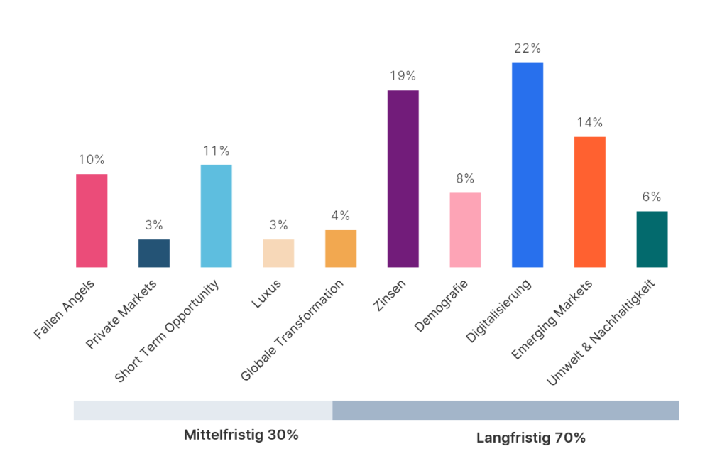 Aktuell würden wir ca. 70% in langfristigen und 30% in kurz- und mittelfristigen Investments halten. Einen Überblick über die Themen, die wir im Fonds halten, gibt die folgende Grafik: