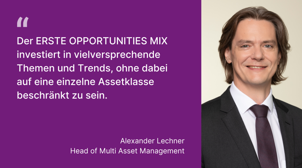 Mit dem neuen Mischfonds ERSTE OPPORTUNITIES MIX können Anleger:innen nicht nur in langfristige Trends wie Umweltschutz oder Digitalisierung investieren, sondern auch kurzfristige Möglichkeiten am Markt nutzen. Wie das funktioniert und was das Besondere an der Investmentstrategie des Fonds ist, verrät Alexander Lechner, Head of Multi-Asset-Management, im Interview.