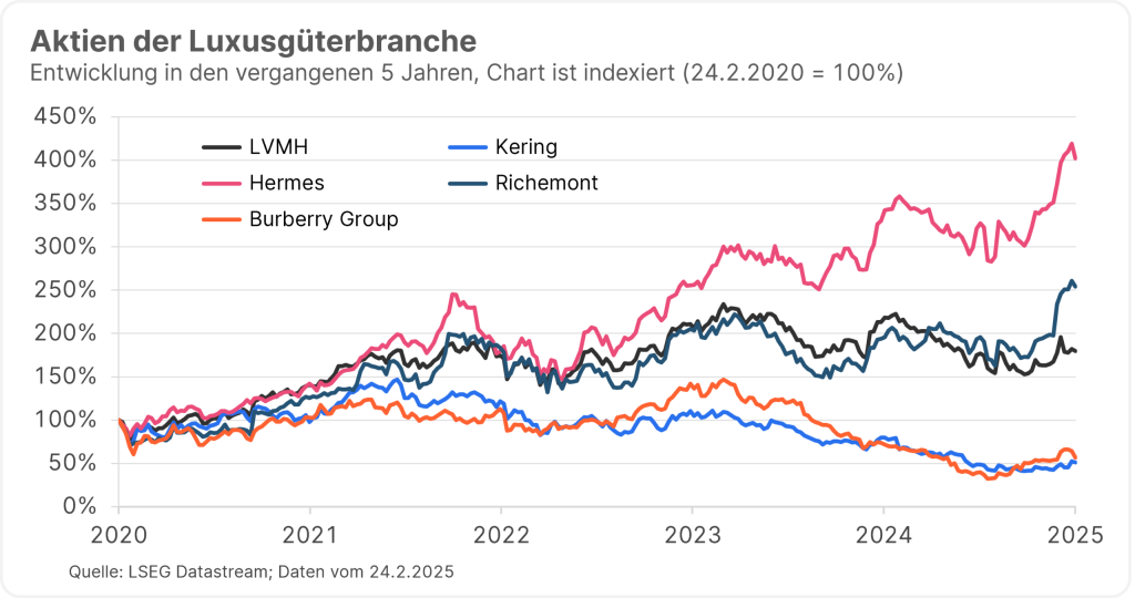 Die wachsende Nachfrage und Kaufkraft der Kunden gepaart mit Preiserhöhungen schlug sich in diesem Zeitraum in höheren Umsätzen und Margen nieder. 2024 gingen die Umsätze aber wieder leicht zurück. Laut Prognosen des Beratungsfirma Bain dürften die Ausgaben für Luxusgüter im abgelaufenen Jahr weltweit um 1 bis 3 Prozent gesunken sein.