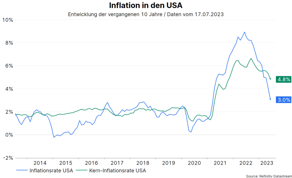 Der Bericht zur Konsumentenpreisinflation in den USA für den Monat Juni zeigte einen stärker als erwarteten Rückgang der Teuerung. Im Jahresabstand lag die Inflation im Juni bei 3,0% – im Mai war dieser Wert noch deutlich höher bei 4,0% gelegen. Auch die Kernrate, also ohne die schwankungsfreudigen Komponenten Nahrungsmittel und Energie, lag mit 4,8% im Juni deutlich unter dem Wert vom Vormonat bei 5,3%.