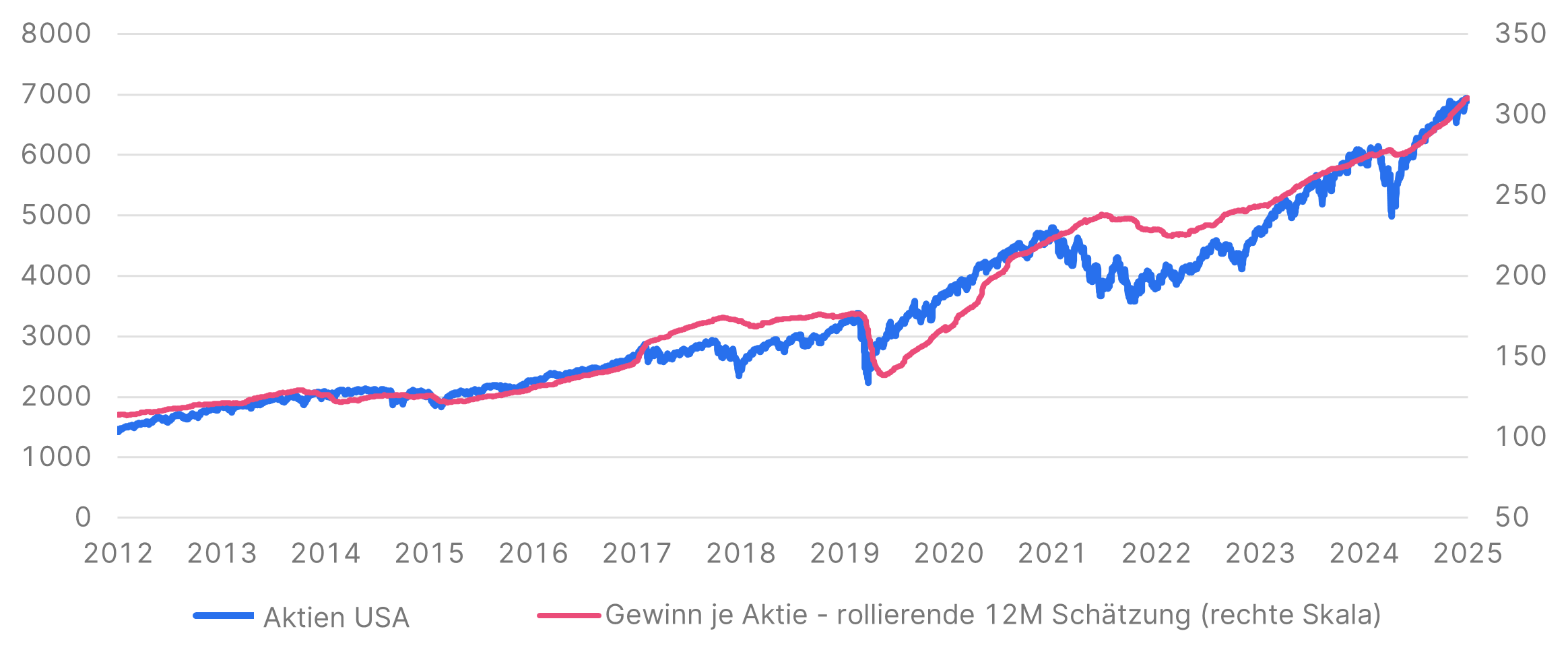 Die Kursgewinne der vergangenen Jahre wurden vor allem durch eine robuste Gewinnentwicklung der Unternehmen getragen. Zwar sind die Bewertungen erhöht, sie liegen jedoch nicht wesentlich über dem Niveau des Vorjahres. Solange die Unternehmensgewinne weiter wachsen, bleibt das Umfeld für Aktien insgesamt positiv.