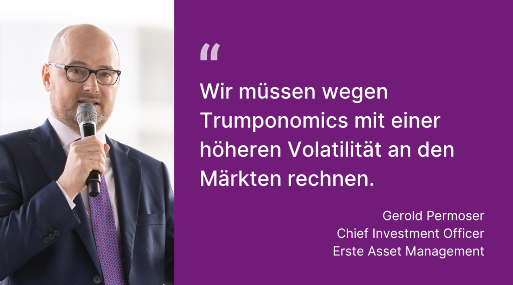 Die andere Seite von „Trumponomics“ – also der wirtschaftlichen Pläne von Donald Trump – zielt auf höhere Zölle und zunehmenden Protektionismus ab. So hat Trump Einfuhrzölle auf chinesische Waren von bis zu 60% und die kurzfristige Umsetzung von Strafzöllen von 25% für sämtliche Waren aus Mexiko und Kanada angekündigt. Sollten diese Pläne in die Tat umgesetzt werden, könnte dies eine Spirale an Einfuhrzöllen auch in Europa und China in Gang setzen. Das würde Waren verteuern, die Exporte beeinträchtigen und damit der weltweiten Konjunktur zusetzen. „Wir müssen daher wegen Trumponomics mit einer höheren Volatilität an den Märkten rechnen“, sagt Permoser.