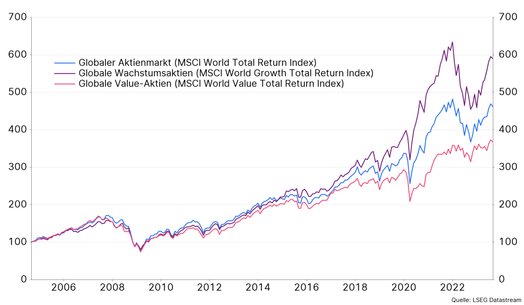 Vergleich Globale Aktien allgemein im Vergleich zu Globalen Wachstumsaktien und Globalen Value Aktien (09/2004-09/2023)