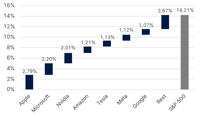 Zudem musste man in den USA die richtigen Aktien im Portfolio halten. Wie die unten dargestellte Grafik zeigt, ist mehr als 80% der Jahresperformance des S&P-500 auf die Entwicklung von nur sieben Aktien zurückzuführen. Es handelt sich einmal mehr um die großen Technologiekonzerne, welche auch in den letzten Jahren oftmals den Gesamtmarkt nach oben zogen. Neben einer überzeugenden Berichtssaison verhalf in den letzten Wochen vor allem der Hype rund um die „KI – Künstliche Intelligenz“ diesen Werten zu einem beträchtlichen Kurssprung. In den Medien spricht man bereits vom nächsten iPhone-Event und dem Anbruch eines neuen Informationszeitalters.
