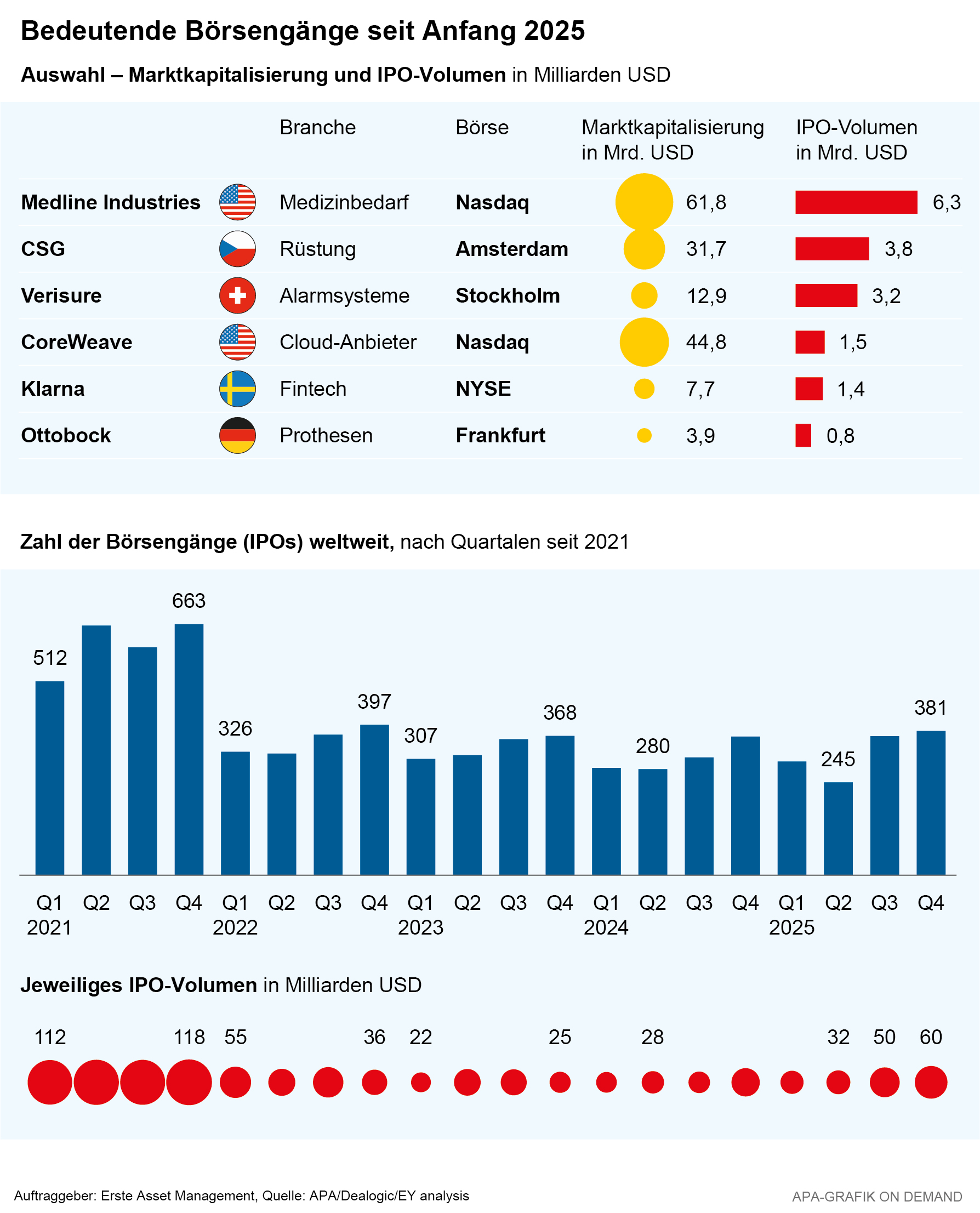 Den weltweit größten Börsengang hat 2025 der Medizinbedarfsanbieter Medline abgeliefert. Das IPO hat dem derzeit mit über 60 Mrd. Dollar bewerteten Unternehmen 6 Mrd. Dollar in die Kassen gespült. Der Börsengang war damit der größte in den USA seit jenem des Elektroautobauers Rivian im Jahr 2021. Auch in Europa gab es einen erfolgreichen Börsengang in der Branche. Der weltgrößte Prothesenhersteller Ottobock aus Deutschland hat bei seinem IPO gut 800 Mio. Euro eingenommen. Die Aktien der beiden Firmen waren gut nachgefragt und konnten beide zum Handelsstart deutlich zulegen.