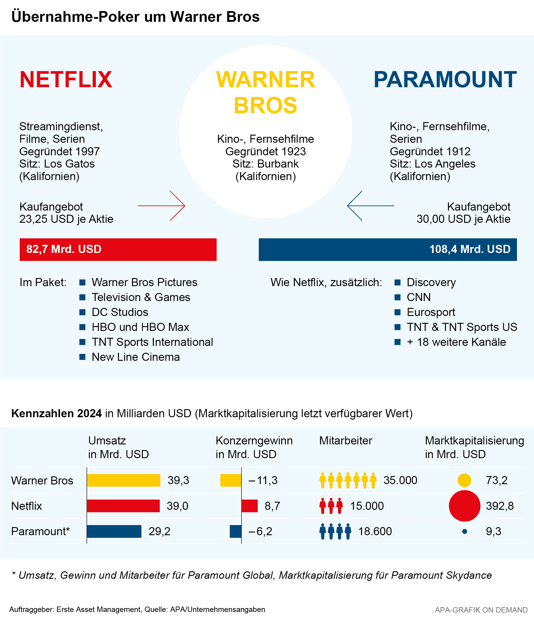 Paramount bietet für den Gesamtkonzern Warner Bros. Discovery 108,4 Mrd. Dollar in bar. Netflix hatte vergangene Woche mit Warner Bros schon eine Übernahme des Studio- und Streaming-Geschäfts von Warner vereinbart, aber ohne die aktuell noch dazugehörenden Fernsehsender wie CNN. Das Netflix-Angebot besteht aus Bargeld und Aktien.