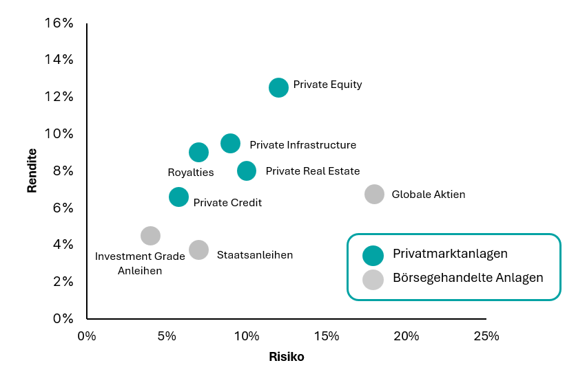 Einzelne Privatmarktsegmente – insbesondere Infrastrukturinvestments wie Energieerzeuger, Telekommunikation, Flughäfen, Häfen oder Datenzentren – bieten häufig planbare, inflationsindexierte Einnahmen. Durch langfristige Verträge oder regulierte Rahmenbedingungen weisen viele Projekte stabile Ertragsprofile auf. Während Private Equity oft auf Wertsteigerungen beim Ausstieg setzt, liefern viele Infrastrukturprojekte kontinuierliche Barrenditen, die die Ertragsstruktur eines gemischten Portfolios verbessern können.