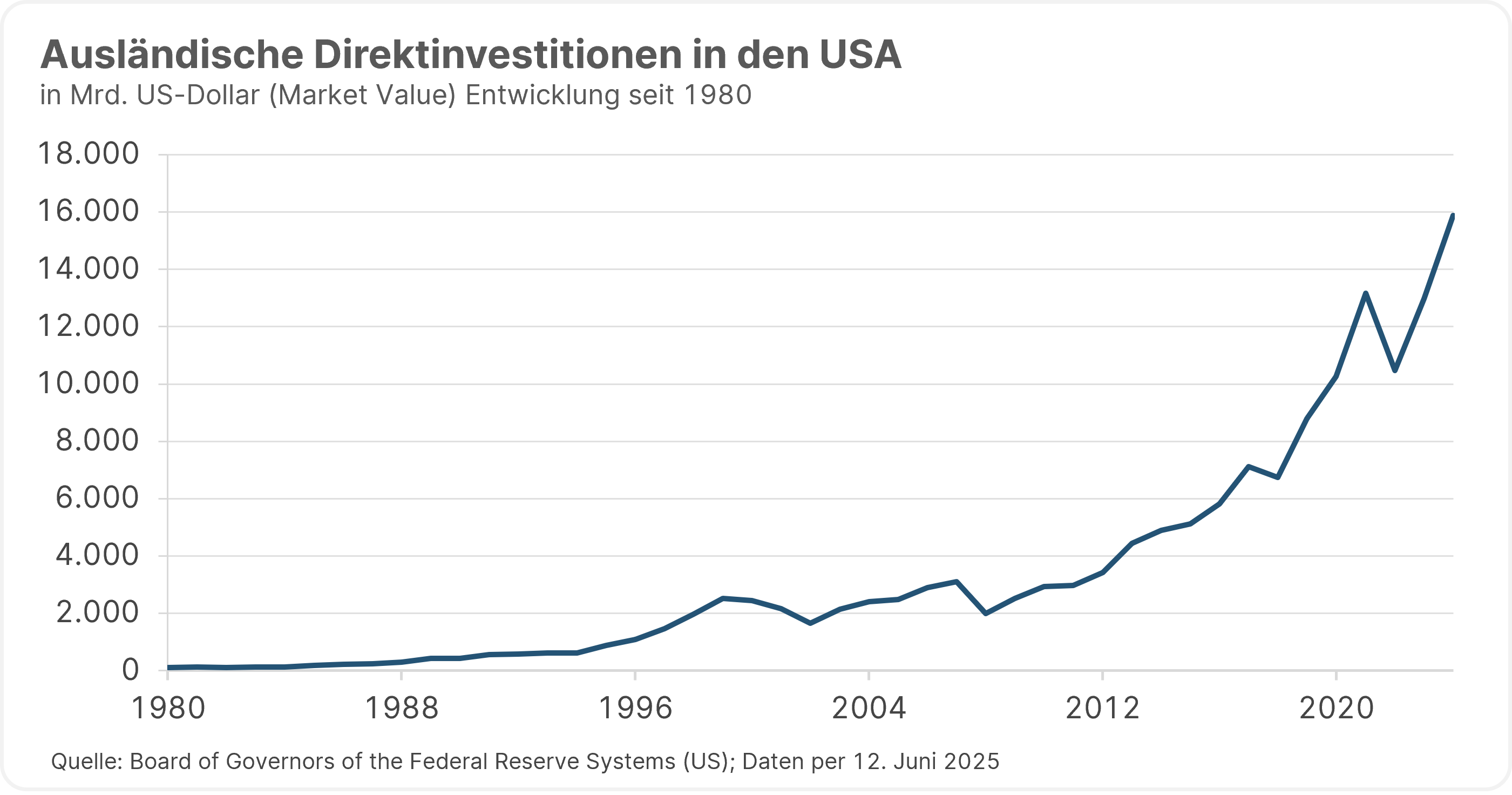 Die Direktinvestitionen aus dem Ausland in die USA sind in den vergangenen Jahren deutlich angestiegen. Internationale Investor:innen halten einen erheblichen Anteil an US-Assets.