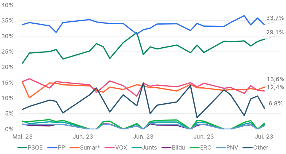 Letzten Umfragen zufolge liegt die PP mit einer etwa 34%-Zustimmung in Führung, aber der Abstand zu der PSOE mit circa 29%, ist deutlich geringer geworden. Um den dritten Platz konkurrieren, mit einigem Abstand, die Parteien Vox (zuletzt etwa 14% der Stimmen) und Sumar. Aktuell liegt die Vox mit einem bescheidenen Vorsprung voran.