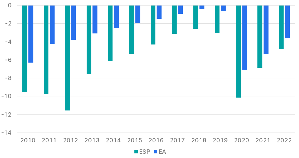 Haushaltsdefizit in % des BIP von Spanien & Durchschnitt im Euroraum