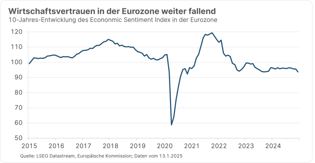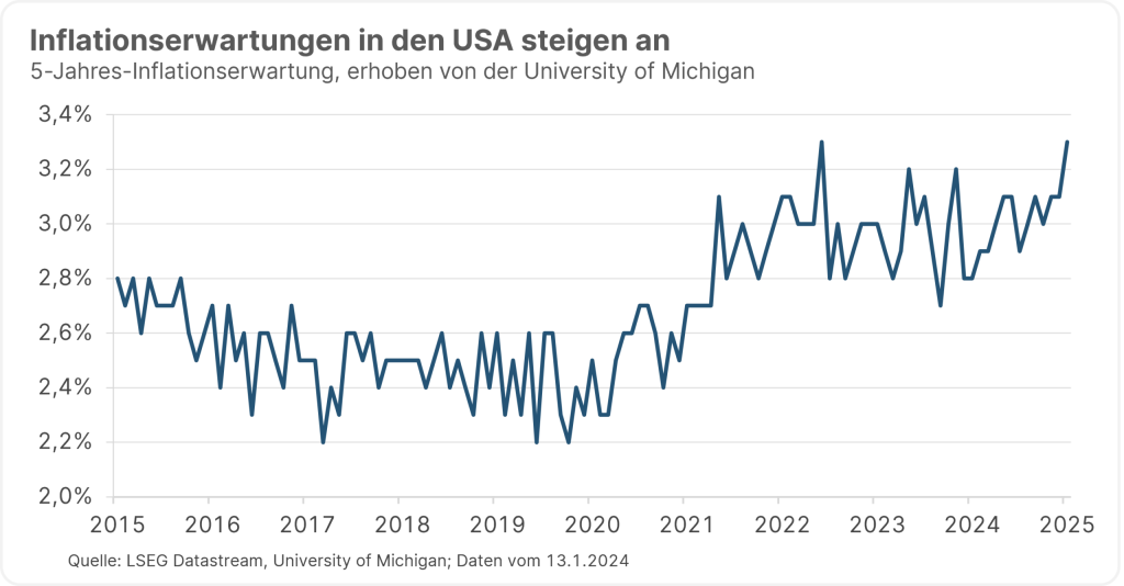 Es ist eine wichtige Voraussetzung für Leitzinssenkungen, dass die langfristigen Inflationserwartungen stabil und niedrig bleiben. Auf der Datenseite hat es diesbezüglich zwei Enttäuschungen gegeben. In der Eurozone sind laut der Europäischen Zentralbank die dreijährigen Inflationserwartungen der Konsumenten von 2,1% auf 2,4% angestiegen (Untersuchung vom November). Der Indikator wies zwischen Oktober 2022 und Oktober 2024 einen fallenden Trend auf. In den USA sind die langfristigen (fünf bis zehn Jahre) Inflationserwartungen der Konsumenten laut der University of Michigan von 3,0% (Dezember-Wert) auf 3,3% (vorläufiger Jänner-Wert) angestiegen. Dieser hohe Wert wurde zuletzt 2008 erreicht (Ölpreisschock).