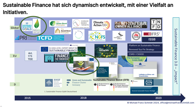 In der Folge von 2015 entstehen viele Initiativen, um an der Erreichung der SDGs und Klimaziele zu arbeiten. Es ist die Entstehungszeit der TCFD, der Task Force on Climate-related Financial Disclosures, und einiger globaler Netzwerke zu Sustainable Finance, vielfach angestoßen durch schon jahrzehntelang etablierte Einrichtungen der Vereinten Nationen wie UNDP, UNEP FI und die schon älteren Nachhaltigkeitsinitiativen wie PRI und UN Global Compact. Zu neuen Initiativen gehören vor allem die verschiedenen „Net-Zero“-Allianzen, 2021 bei der COP 26 unter dem Dach der GFANZ (Glasgow Financial Alliance for Net Zero) zusammengefasst. Ferner entsteht mit dem NGFS, dem Network for Greening the Financial System, eine einflussreiche internationale Plattform von Zentralbanken und Aufsichtsbehörden, deren Analysen, insbesondere zu Klimaszenarien, als Best Practice in die konkrete Aufsichtsarbeit einfließen und so auf Strategie und Risikomanagement der Finanzinstitute wirken.
